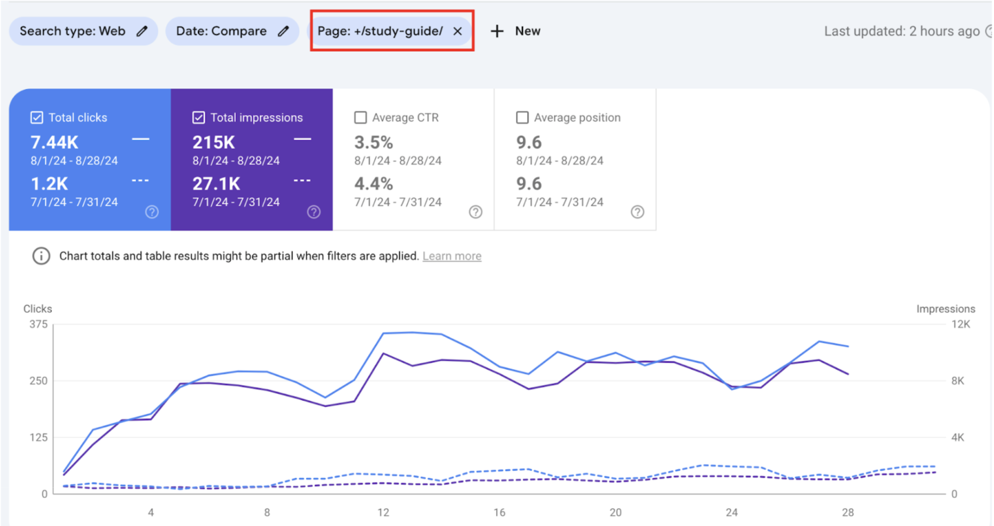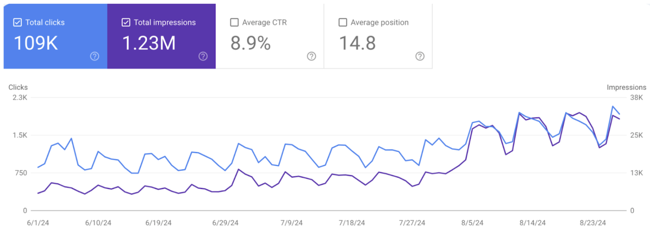 За останній місяць (8/1/24 – 8/27/24) кількість кліків на блог збільшилася до 7.12 тисяч порівняно з 986 у попередньому місяці (7/1/24 – 7/27/24). Кількість показів зросла з 21.7 тисяч до 206 тисяч. Середній CTR знизився з 4.5% до 3.5%