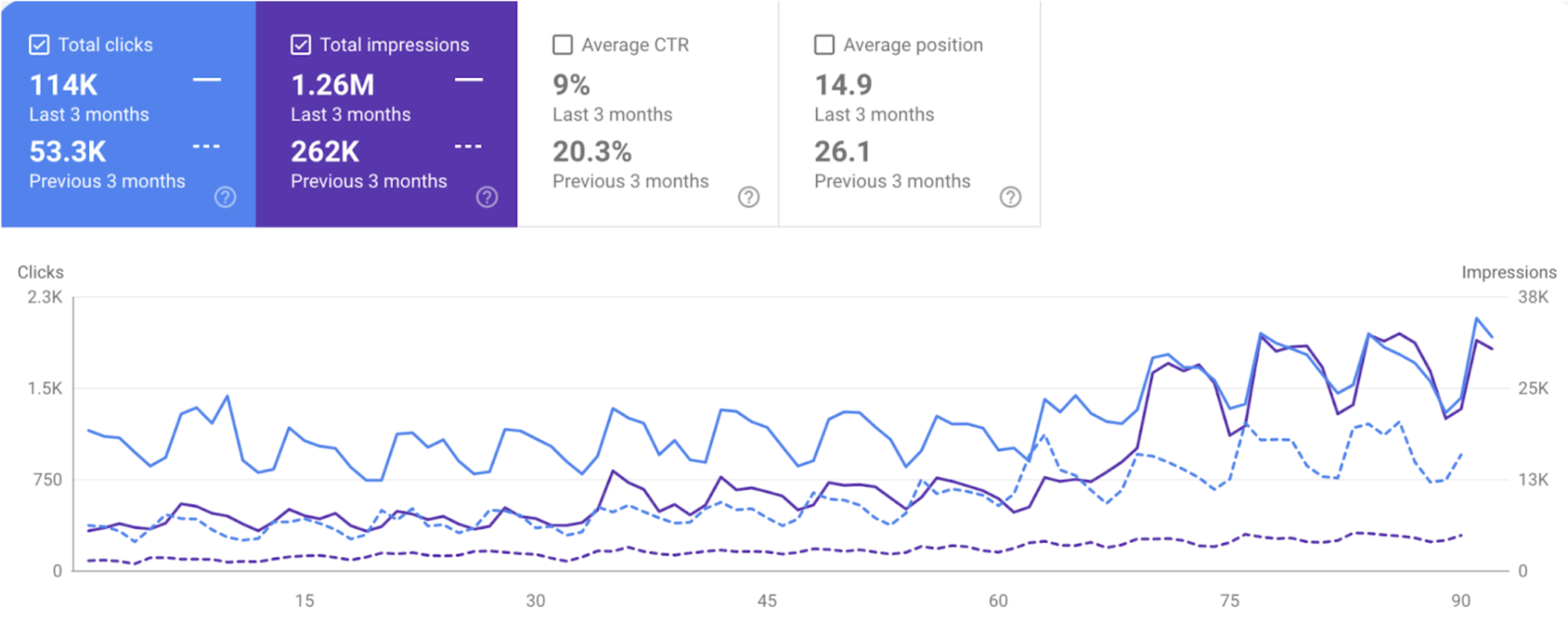 За останні три місяці нашої праці сайт отримав 114 тисяч кліків, порівняно з 53.3 тисячами кліків за попередні три місяці. Трафік зріс більш ніж удвічі.