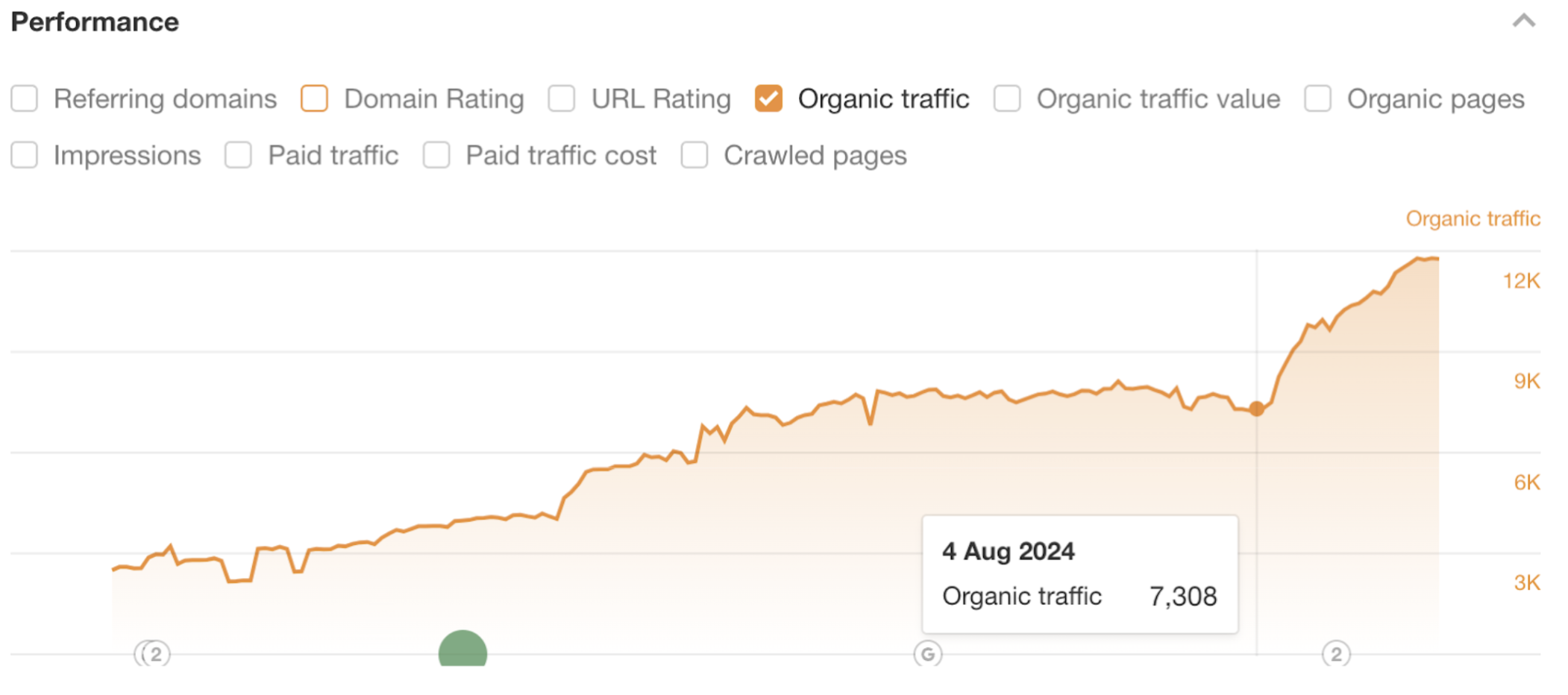 На цьому графіку видно різке зростання органічного трафіку на сайт, починаючи з 4 серпня 2024 року, коли трафік становив 7,308 відвідувачів. Це збільшення співпадає з часом впровадження 301 редіректів з інших сайтів і відкриття доступу до блогу для всіх користувачів, що можна вважати причиною підвищення відвідуваності. Значний приріст трафіку свідчить про успішність цих змін.