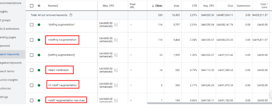 Радимо замінити даний тип відповідності на точну. Це допоможе знизити ціну кліку та позбутись нецільових пошукових термінів. Або фразова відповідність для середньочастотних ключових слів.
