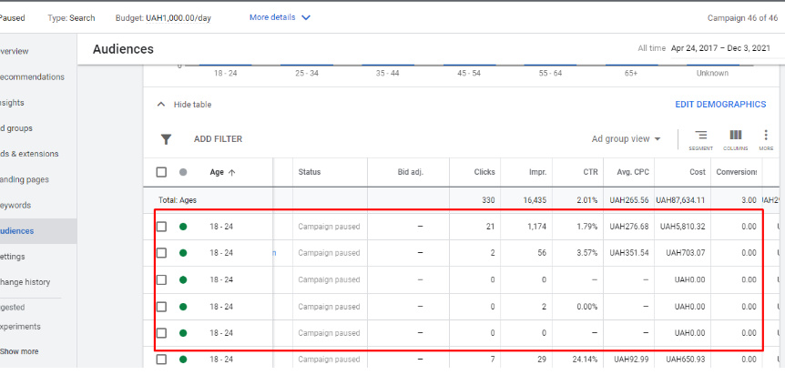 Увімкнений вік аудиторії 18-24. Чи є вони цільовини для вашої ніші? Чи приведуть до конверсії? Радимо пропрацювати це питання, при необхідності – вимкнути.