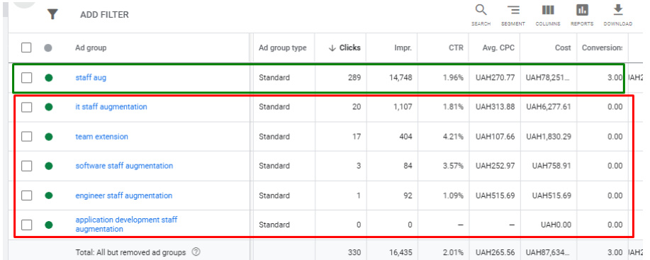 Групи оголошень: на рівні групи оголошень виставлені ставки 0,01, хоча на рівні ключових слів є ручне коригування. Фактично з усіх працюючих груп лише 1 конвертувала та була ефективною, усі інші не приводили до дій. Варто було після проходження часу експерименту 2-3 тижні ставити їх на паузу, або оновити семантику: