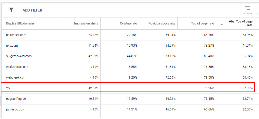 Статистика аукціонів: власне через низький бюджет і вибрані ручні ставки, реклама займала не зовсім цільові позиції на першій сторінці показу гугл видачі, і охоплювала лише 27% частки абсолютних показів над результатами гугл-видачі: