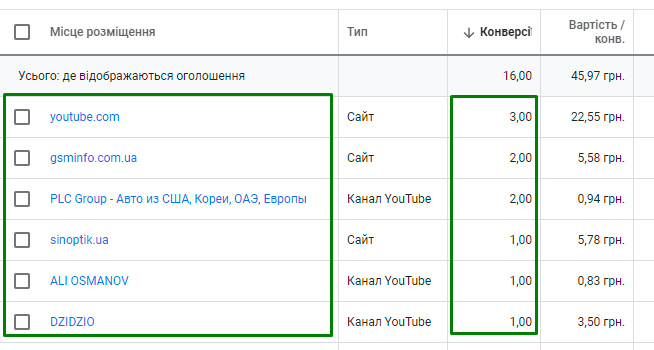 При запуску такої змішаної рекламної кампанії можна ще зайти у вкладку «Місця розміщення» і знайти ефективні майданчики, з яких приходять конверсії. Надалі можна запустити окрему стандартну Медійну рекламну кампанію, націлених на ці майданчики.