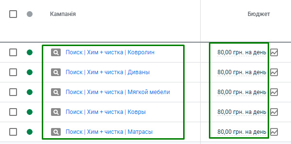 Запускаємо 5 класичних пошукових кампаній, із мінімальним денним бюджетом на кожну із них по 80 гривень.