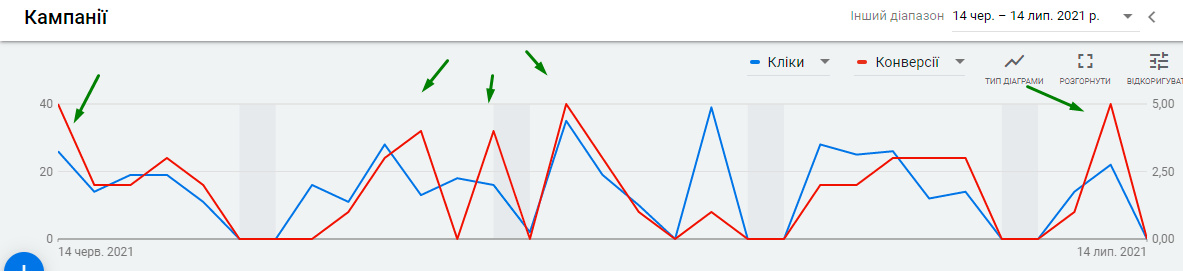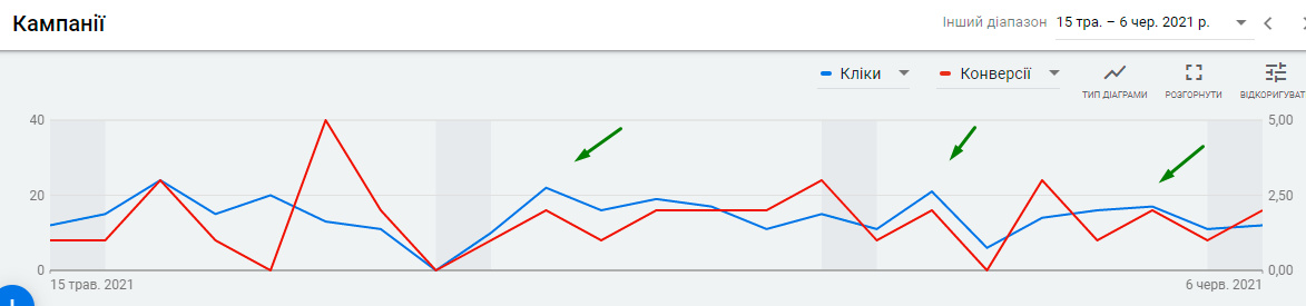 Навчаємо кампанії 2-3 тижні на стратегії Максимум кліків, і коли вже отримуємо стабільний потік конверсій, переводимо на стратегію Максимум конверсій.