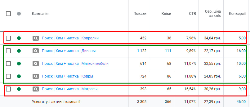 По показниках реклами порівнюємо показники реклами, та співвідношення конверсійності та вартості ціни за клік, та виділяємо напрямки по яких отримуємо найменш вигідні для клієнта результати: