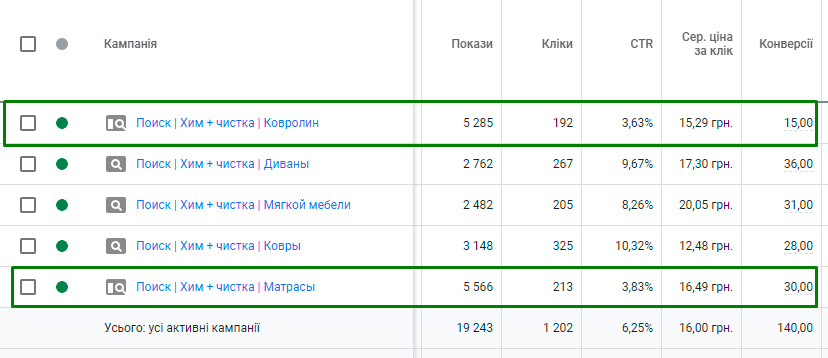 5 окремих напрямків послуг хімчистки : ковроліни, дивани, м’які меблі, коври та матраци. Аналізуємо вартості кліків на кожен із напрямків та загруженість ринку у кожному із них.