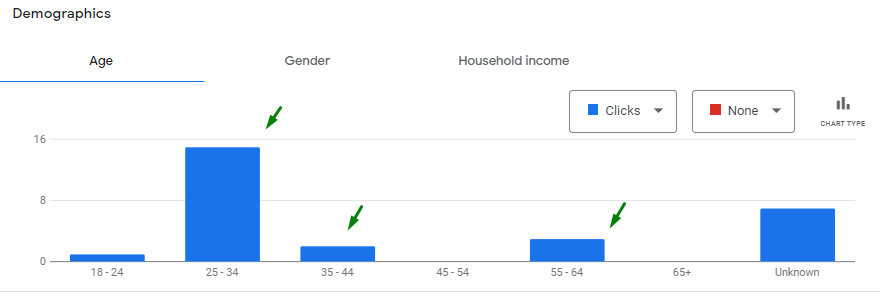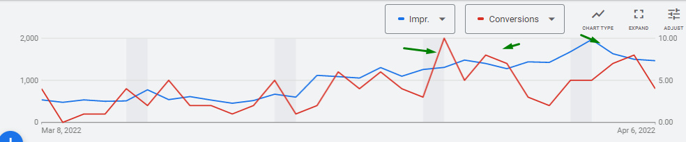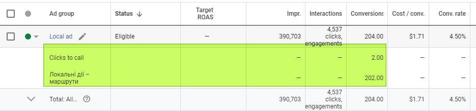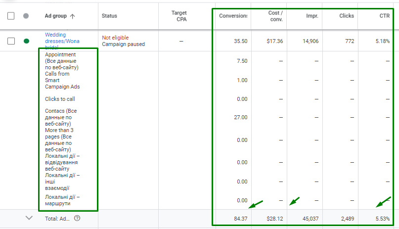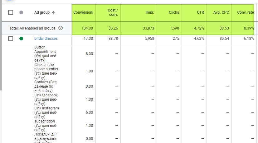 Здійснено 45 037 показів оголошень у гугл пошуку, отримано 2489 переходів на сайт, середня вартість кліку 0,95$, отримали 84 конверсії по середній вартості 28,12 $, і показник CTR 5,53 % (дещо низький показник якості). Шукаємо шляхи підвищення показника CTR та зниження вартості конверсії.