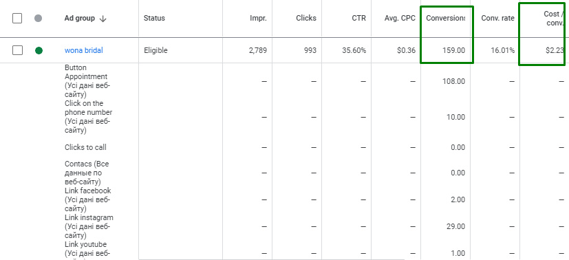 За 30 днів здійснили 2789 показів текстових оголошень у гугл пошуку, отримали 993 кліки із переходом на сайт, 159 конверсій із взаємодіями, середня ціна конверсії 2,23 $, із коефіцієнтом конверсії 16,01%