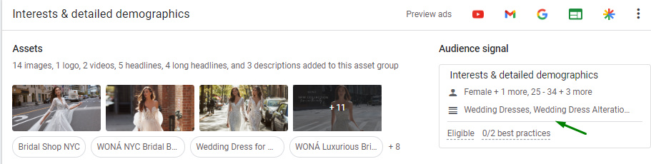 Попередньо аналізуємо ситуацію на ринку, оцінюємо рекламу та пропозиції конкурентів та їх цінність. Опісля готуємо до запуску брендову рекламу під бренди, по яких наш шоурум є офіційним представником – WONA та Eva Lendel. Це дозволить нам одразу вирішити 2 питання – показуватись аудиторіям, які вже націлено шукають сукні обраних брендів, почати показувати рекламу на рівні із конкурентами, які уже рекламуються під бренд.