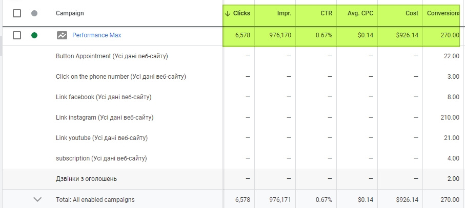 Здійснили показ оголошень на всіх напрямках 976 173 рази, отримали 6578 кліків із переходом на сайт, середня вартість кліку 0,14 $, зафіксували 270 конверсій, середня вартість конверсії 3,43 $