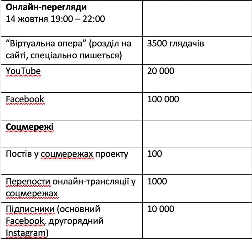Постановка КРІ: У проєкту є серія завдань, частина з яких є чітко обчислюваними (для звітності перед УКФ), а частина бажаними (потрібні для іміджу та розвитку опери).