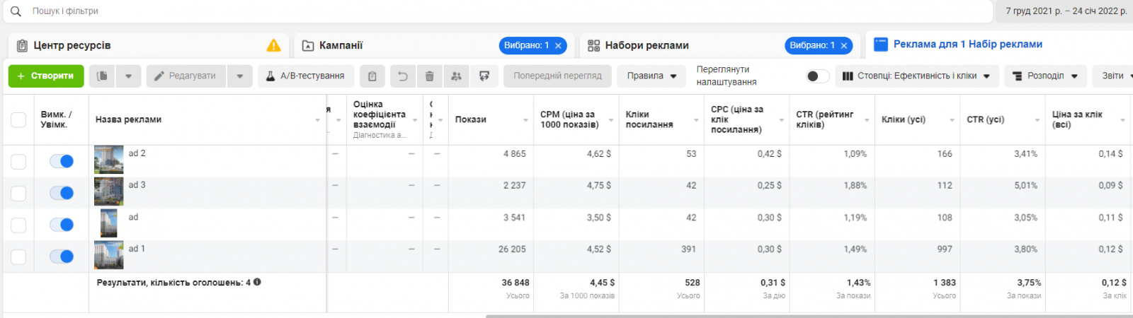 Етап 3. Вивчали кожну кампанію та кожне оголошення, кожну аудиторії та її фідбек. Аналізуємо топ-оголошення: залишаємо їх, переносимо на інші кампанії – з поправками на аудиторію та тип реклами. За потреби – перерозподіляємо бюджет.