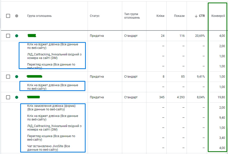 - розділили під окремі групи оголошень, ключові слова використали у точній та фразовій відповідності;