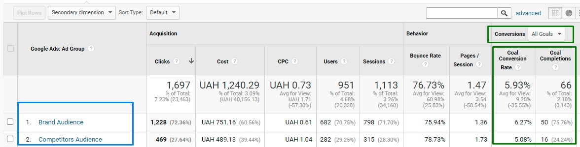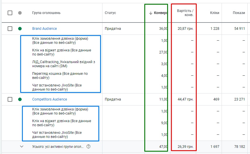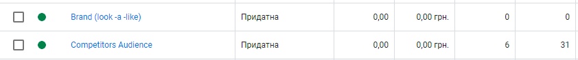 - брендова аудиторія – 36 конверсій по вартості 20,87 грн