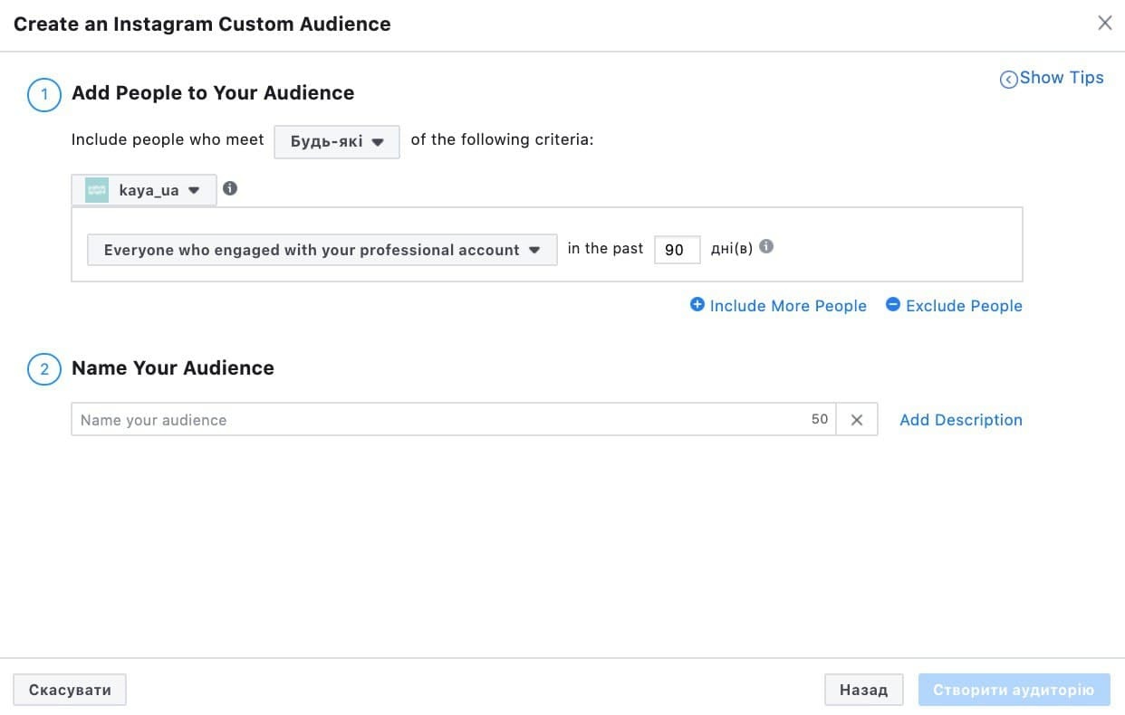 2. Налаштування аудиторії, яка взаємодіяла з Facebook та Instagram