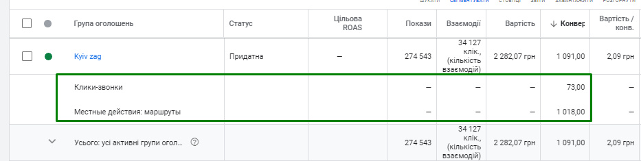 У період із 01 до 30 листопада здійснили показ рекламних локаційних оголошень 274 543 рази, отримали 34 127 взаємодій, в результаті зафіксували 1091 конверсії ( з яких 73 кліки-дзвінки та 1018 місцевих дій із прокладанням маршрутів), при вартості конверсії 2,09 грн.