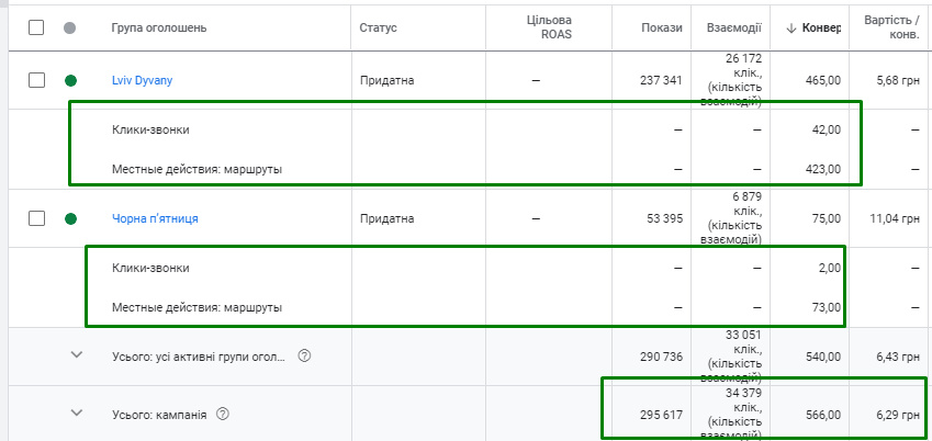У період із 01 до 30 листопада здійснили показ рекламних локаційних оголошень 295 613 рази, отримали 34 379 взаємодій, в результаті зафіксували 540 конверсії ( з яких 44 кліки-дзвінки та 496 місцевих дій із прокладанням маршрутів), при вартості конверсії 6,29 грн.