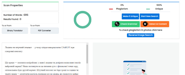 Варто пам’ятати й про те, що нейронна мережа намагається зробити свої тексти більш-менш читабельними, а не унікальними. Як результат, середній відсоток запозичених фрагментів коливається від 10 до 50%. Цього занадто багато, щоб розміщувати статтю на сайті без глибокого рерайту. Звісно, ви можете попросити штучний інтелект підвищити унікальність. Але не чекайте феноменальних результатів — вам вдасться позбутися лише кількох відсотків плагіату, здебільшого ціною ще більшої заспамленості й меншої змістовності.
