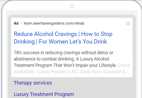 Теоретично з 2018 року рекламна видача за запитами типу «how to stop drinking» має припинитися, проте у 2022 році вбиваючи цей запит у пошукову строку, ми бачимо рекламні оголошення. Отже, є можливість пройти модерацію і знайти шлях побудови реклами для відповідності системи правил Google.