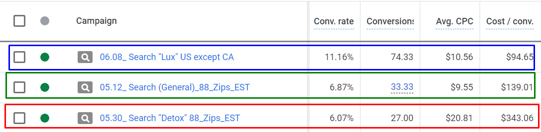 - і кампанію під Детокс-напрямок конверсій найменше і вони найдорожчі у розрізі ціни за залучення клієнта.
