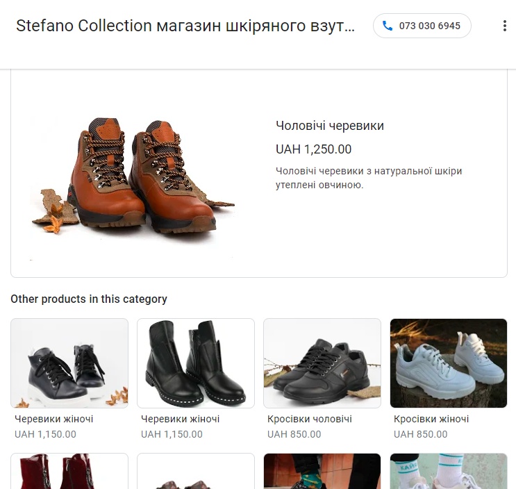 При переході на товар у видачі є зображення товару, його характеристики, ціна та номер телефону магазину. Нижче подаються схожі товари в обраній категорії.