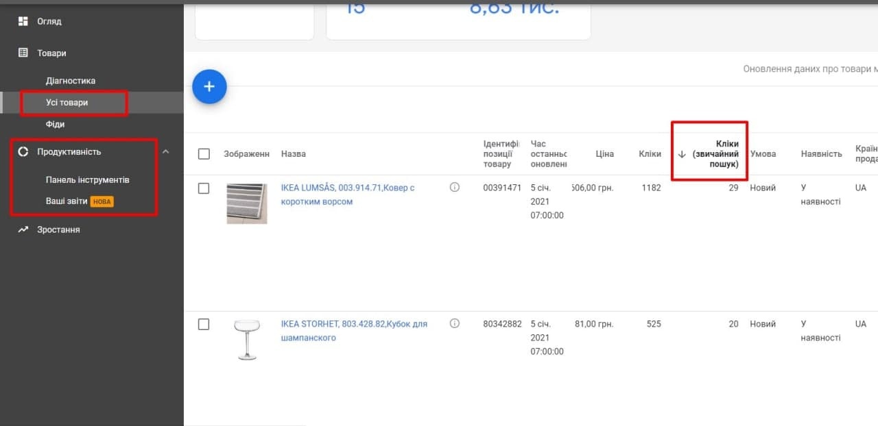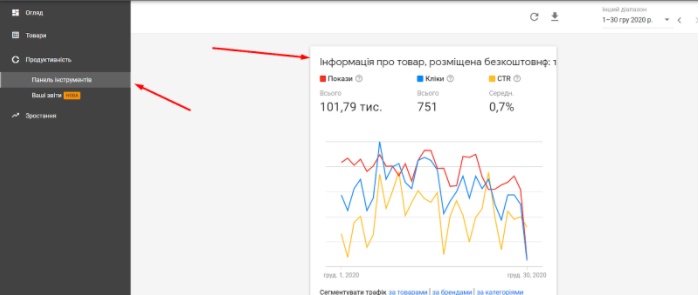 В Google Мерчант Центрі звіт за переходами можна побачити в розділі Продуктивність → Панель інструментів