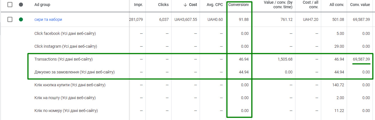 Фіксуємо отриманих 92 конверсії, з яких 46 транзакції на сайті, 218 замовлень через корзину, 28 прямих дзвінків із реклами та 8 заповнених форм для зворотнього дзвінка.