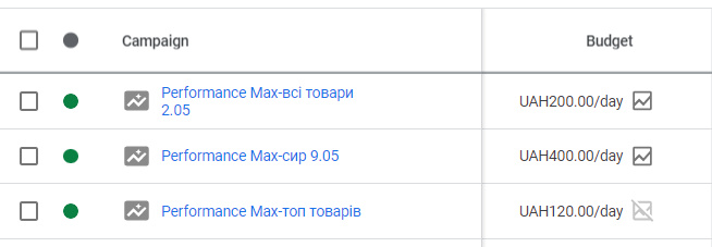 Погодивши з клієнтом, створюємо 3 окремі торгові кампанії із розділенням груп товарів по цінах. Це дозволить нам більш детально побачити картину ефективних товарів, та вимкнути неконверсійні та неприбуткові категорії із показу торгових оголошень.