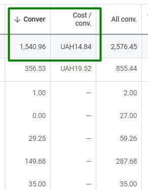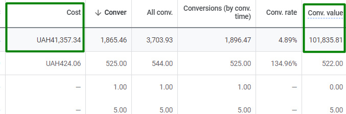 При витрачених коштах на рекламу 41 357 грн вдалось заробити 101 835 грн. Вартість конверсії опустилась до 14,84 грн ( при початковій з моменту запуску торгових кампаній – 46 грн)