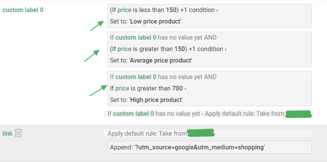 У Мерчант центрі задаємо параметри Правил фідів, і розділяємо його на 3 категорії по цінах: топ товари, усі сири, усі категорії з виключеними товарами з інших кампаній: