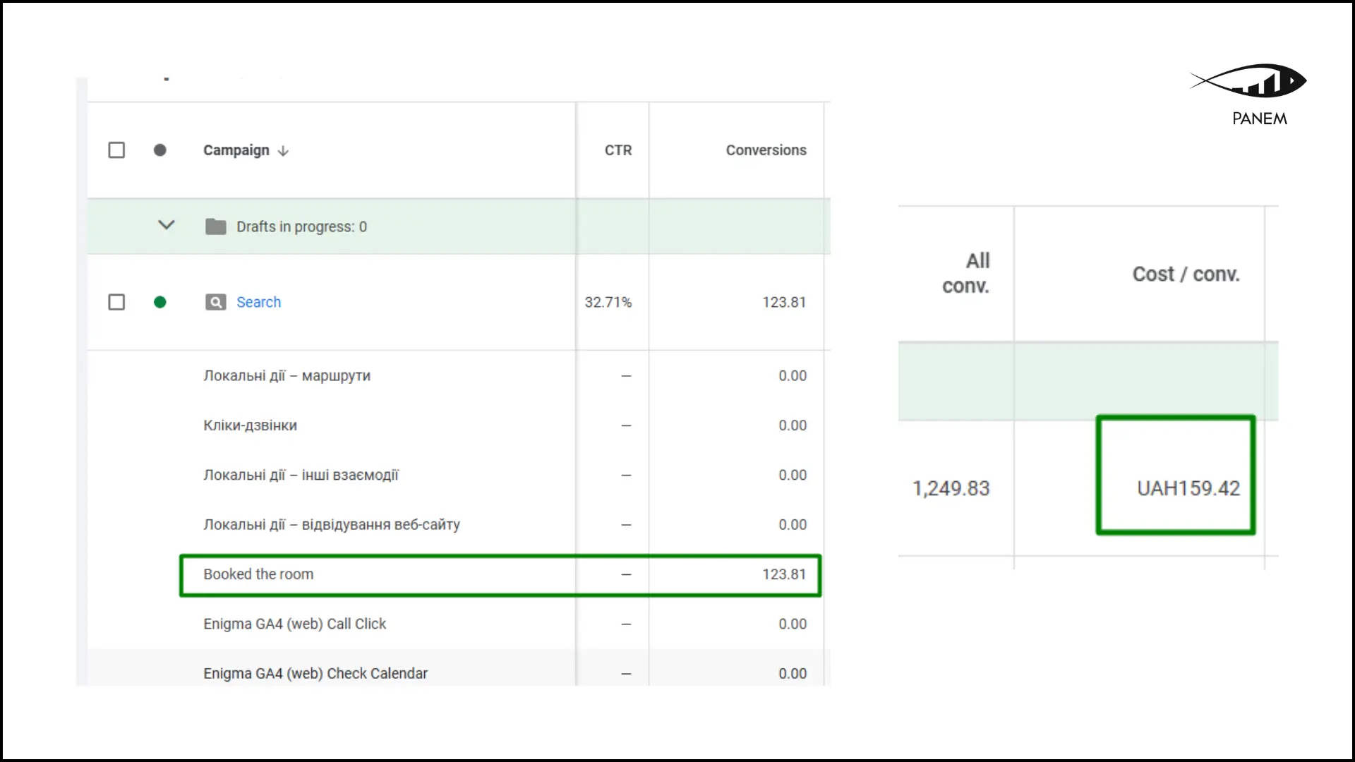 - По-перше, ми переналаштували систему відстеження конверсій, оскільки попередньо в Google Ads фіксувалися не всі потрібні дії. Основною подією для оптимізації залишили лише “бронювання кімнати” — саме ця дія є ключовим показником ефективності бізнесу. Інші події, як “побудова маршруту” або “перехід за номером телефону”, ми перевели у другорядні, щоб вони не впливали на алгоритм оптимізації. Завдяки цьому Google почав навчатися саме на користувачах, які справді бронюють квест, а не просто відвідують сторінку, — що суттєво підвищило точність роботи системи.