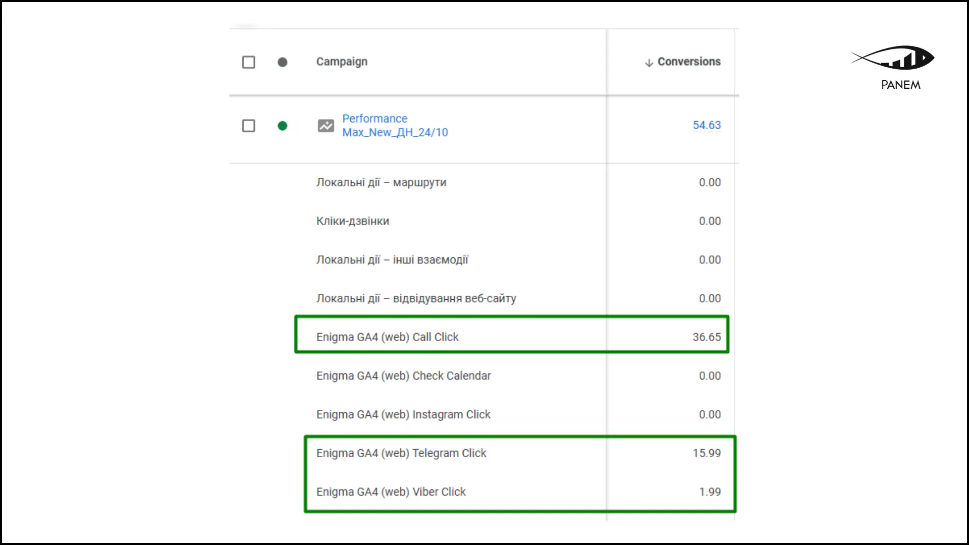 Результати цього етапу перевершили очікування. При денному бюджеті лише 100 грн кампанії Performance Max принесли 54 конверсії за перший місяць, серед яких 37 бронювань через телефон, 16 переходів у Telegram і 1 — у Viber. Середня вартість конверсії (CPA) склала 54,35 грн, а CTR медійних оголошень досяг рівня 4,1%, що для розважальної ніші є дуже високим показником.