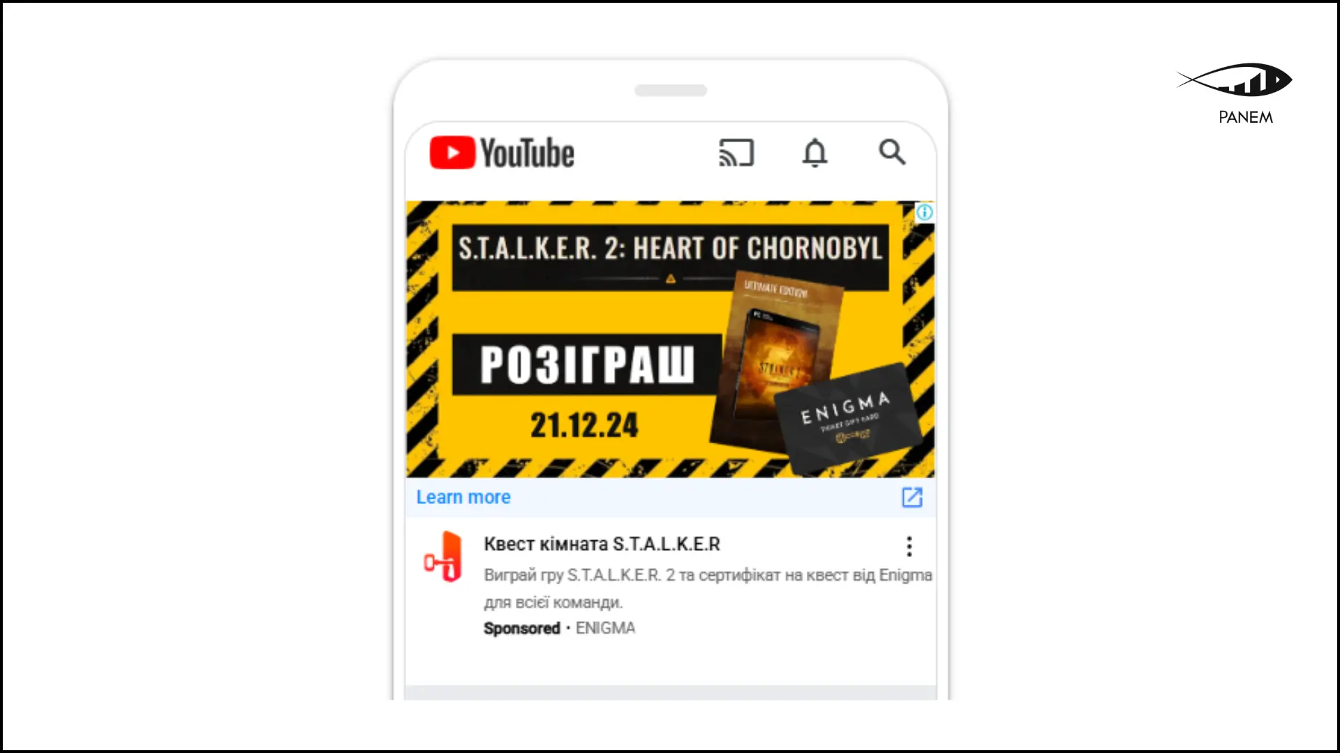 Для цієї кампанії ми розробили унікальні банери з елементами атмосфери гри неонові світлові ефекти, темні фони, радіаційні символи — щоб максимально передати настрій квесту.